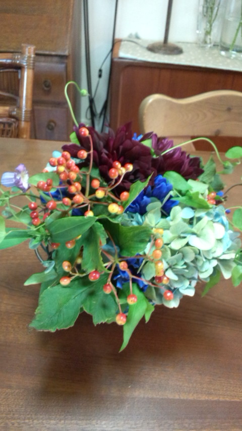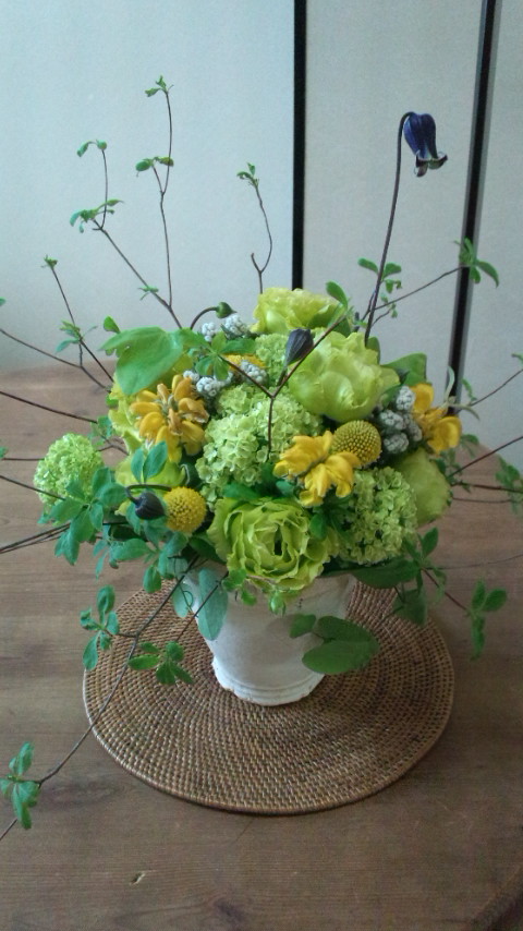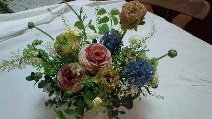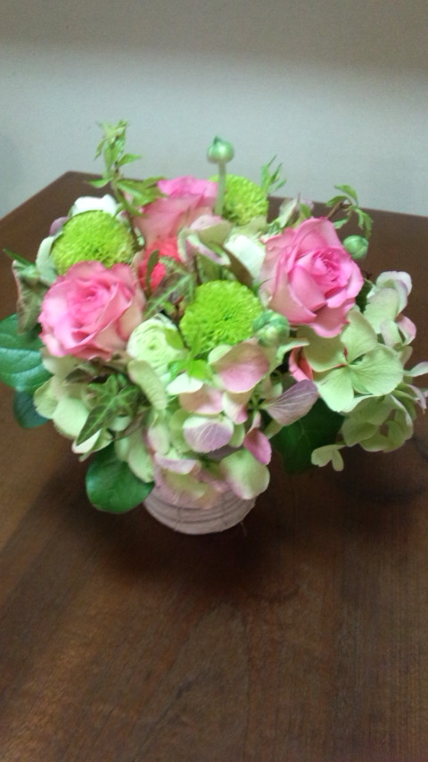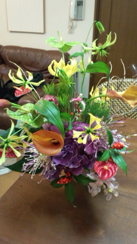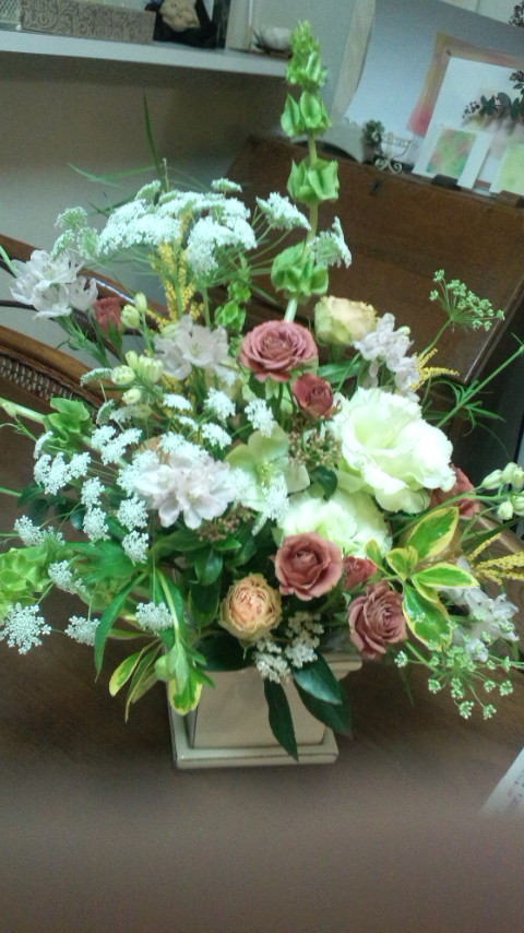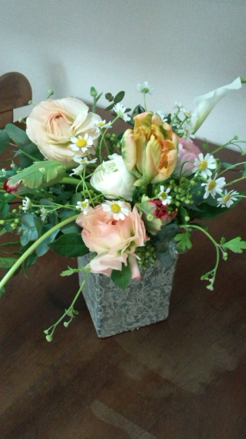 色々な花を使用したら訳がわからなくなり多色使いの悩めるアレンジになってしまいました。