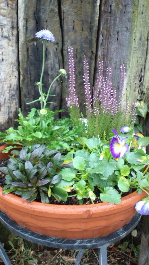 紫のスカビオサとカルーナというエリカに似たピンクの花、アジュガという濃い赤紫の葉の植物…春には紫の花が咲くようです。そして虹色スミレという名の多色パンジーの寄せ植えです。