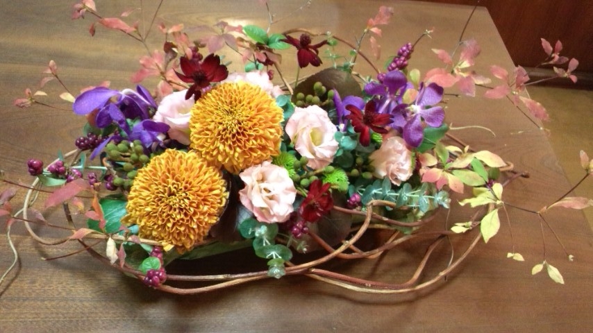 記憶が定かではありませんが、オレンジの菊をメインにチョコレートコスモスやピンクのバラ、どうだん紅葉を使い、秋らしさをだしています。