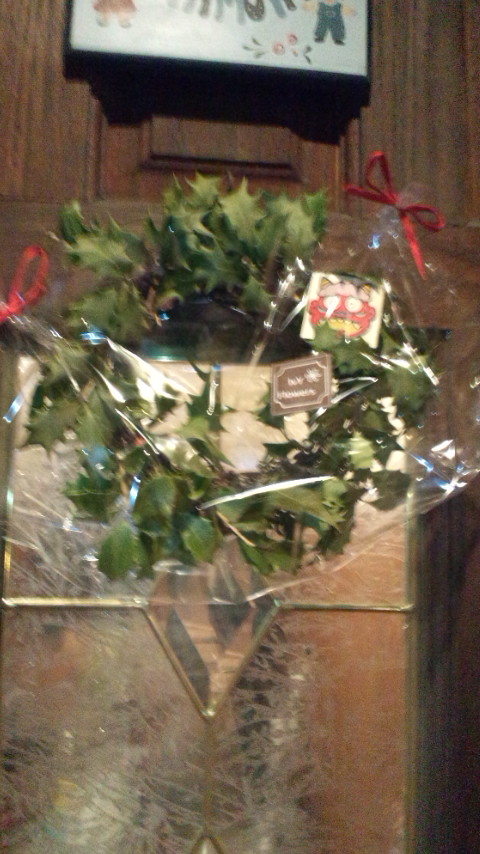 先日名東区の花屋さんで見つけたヒイラギのリースを玄関に飾ってみました。